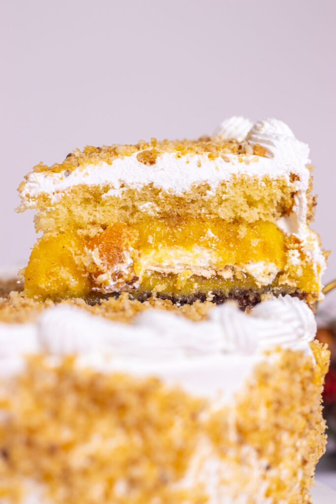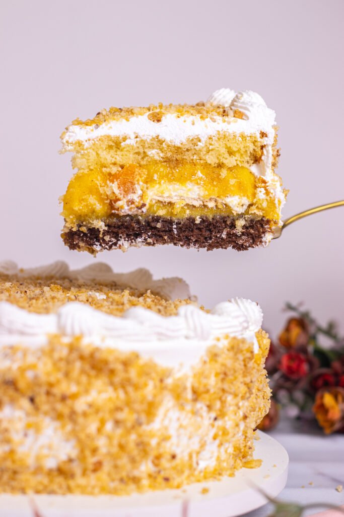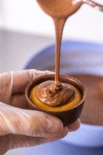 Pão de mel dentro de uma casquinha de chocolate com uma camada de doce de leite cremoso e banhado em licor.