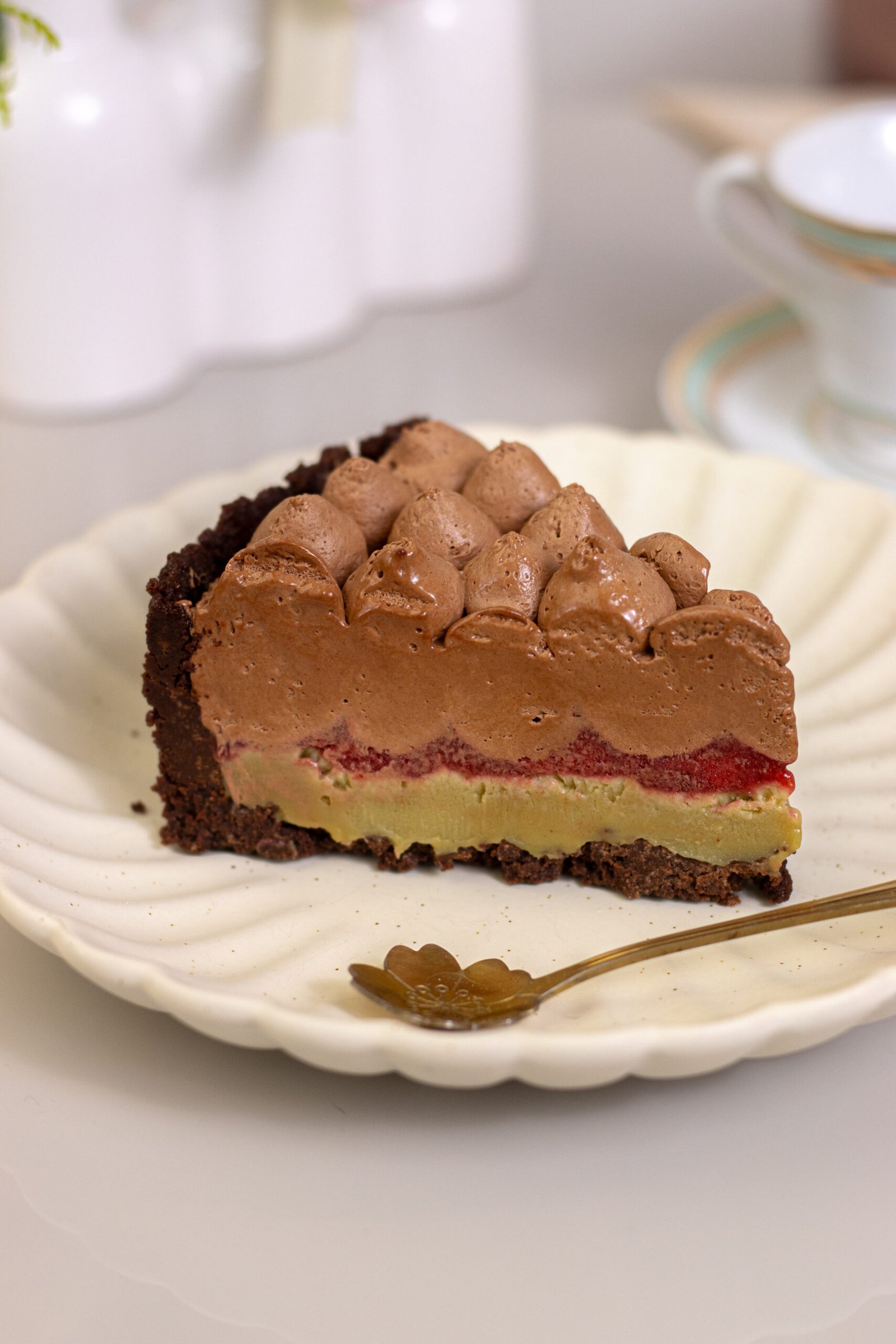 Uma explosão de sabores! Nossa torta é feita com base de biscoitos de chocolate, recheada com 3 camadas: brigadeiro de pistache, geléia de morango artesanal e mousse de chocolate blend. Uma combinação perfeita e refrescante. Para surpreender e se apaixonar!